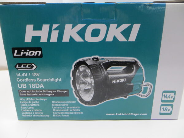 HiKOKI UB18DA er en kraftfuld, trådløs LED-søgelygte/arbejdslampe, der kan bruges med HiKOKIs 14,4V, 18V og MultiVolt slide-batterier. Den er designet til at give alsidig belysning på arbejdspladser og kan fungere som både lommelygte, søgelygte og bredspektret arbejdslampe.