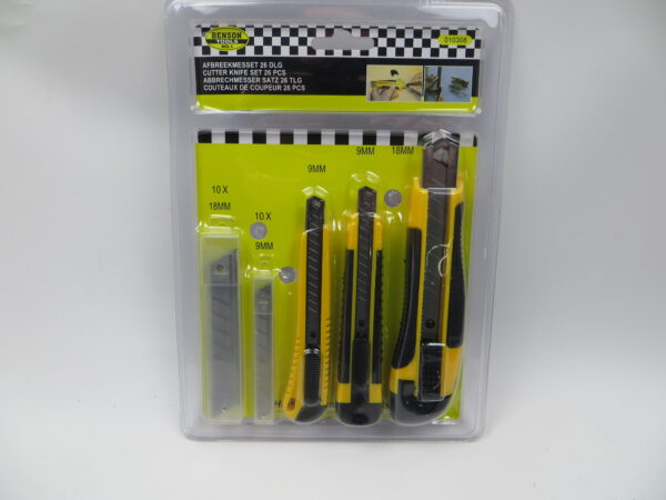 Praktisk og alsidigt hobbyknivsæt fra Benson Tools med i alt 26 dele. Sættet indeholder tre ergonomiske afbryderknive i forskellige størrelser samt ekstra knivblade, så du altid har en skarp kniv ved hånden. Knivene er velegnede til præcisionsarbejde, hobbyprojekter, tapet, pap, plast, folie og andet let skærearbejde. Leveres i praktisk blisterpakning, der holder orden på alle dele.
