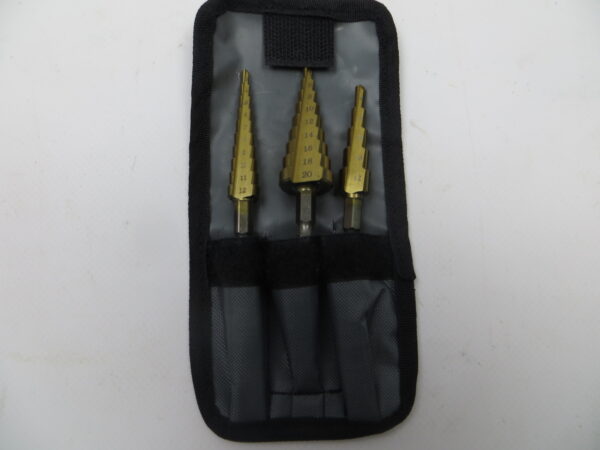 Dette er et sæt trinbor, også kendt som HSS pladebor, der typisk bruges til at bore i tynde materialer som metalplader.